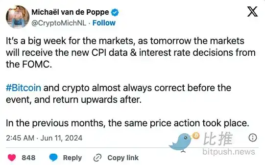他指出:「在之前的 FOMC 会议之后,市场迅速反弹,在之前的会议之后,以太坊多次反弹 20% ,而自美联储最近召开会议以来,比特币也飙升了 20% 以上。」