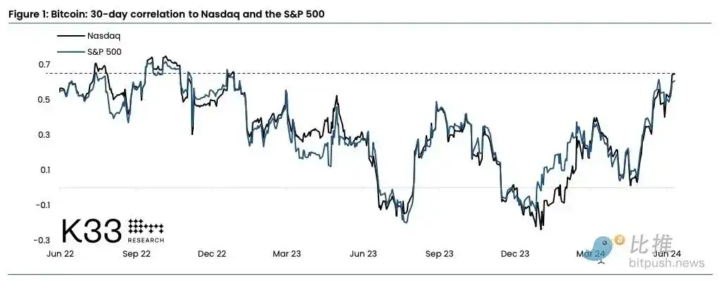 与此同时,比特币与传统风险资产的关联性比平时更高。K 33 分析师发布的图表显示,比特币与美国股市的相关性已达到 18 个月以来的最高水平,上周比特币与纳斯达克的 30 天相关系数自 2022 年以来首次增长至 0.64 。