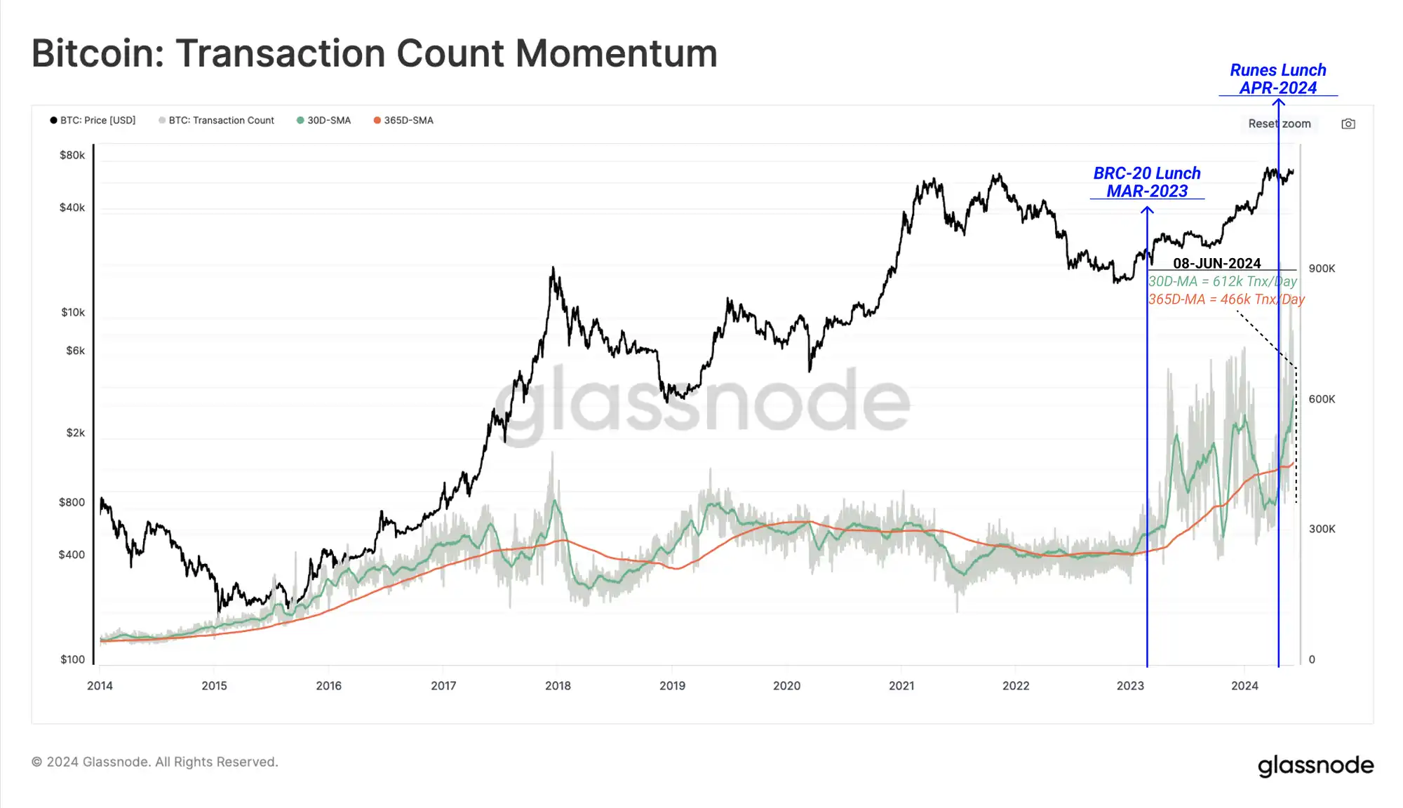 随着 Runes 协议在减半时(2024 年 4 月 20 日)推出,对 Runes 交易的需求飙升至每天 60 万至 80 万之间,此后一直保持高位。