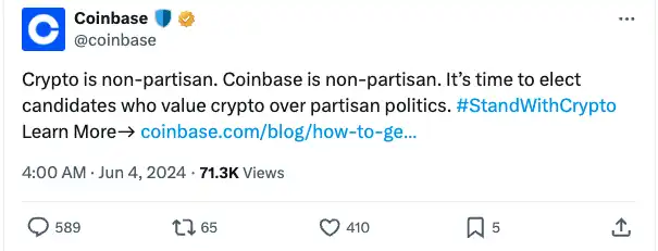 一周前,加密货币交易所 Coinbase 表示,「它向专注于加密货币的超级政治行动委员会 (PAC) Fairshake 捐赠了 2500 万美元,以在 11 月美国大选前加大游说力度。」