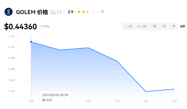 GOLEM 当前价格为 $0.44360。GOLEM 的价格在过去 24 小时内下跌了 -1.71%。目前,GOLEM 市值排名为第 95 名,实时市值为 $4.43亿,流通供应量为 1,000,000,000 GLM,最大供应量为 1,000,000,000 GLM。我们会实时更新 GOLEM/USD 的价格。GOLEM 价格表现 (美元)