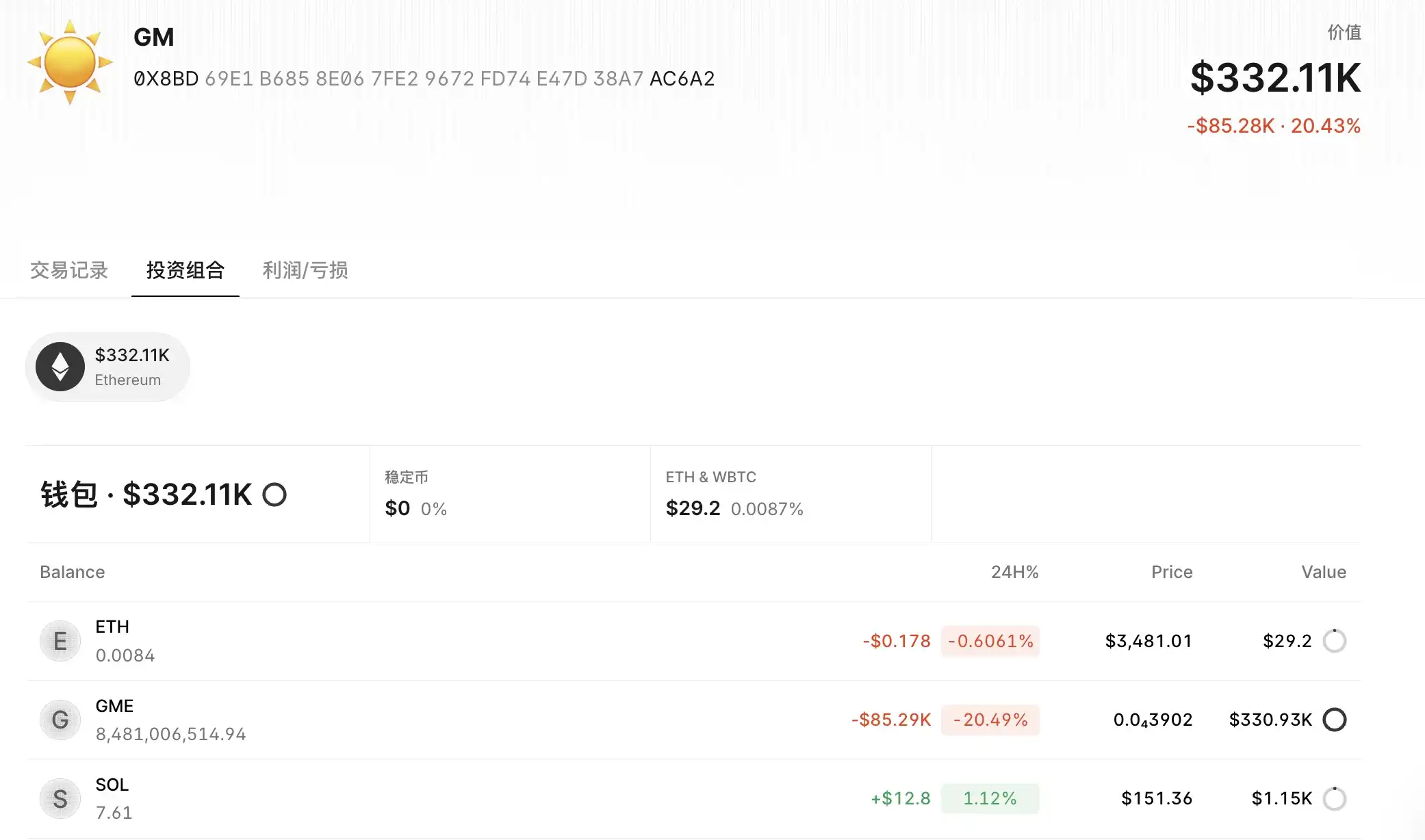 钱包资产:主要为 GME 及少量 ETH、SOL,余额为 33.2 万美元左右;