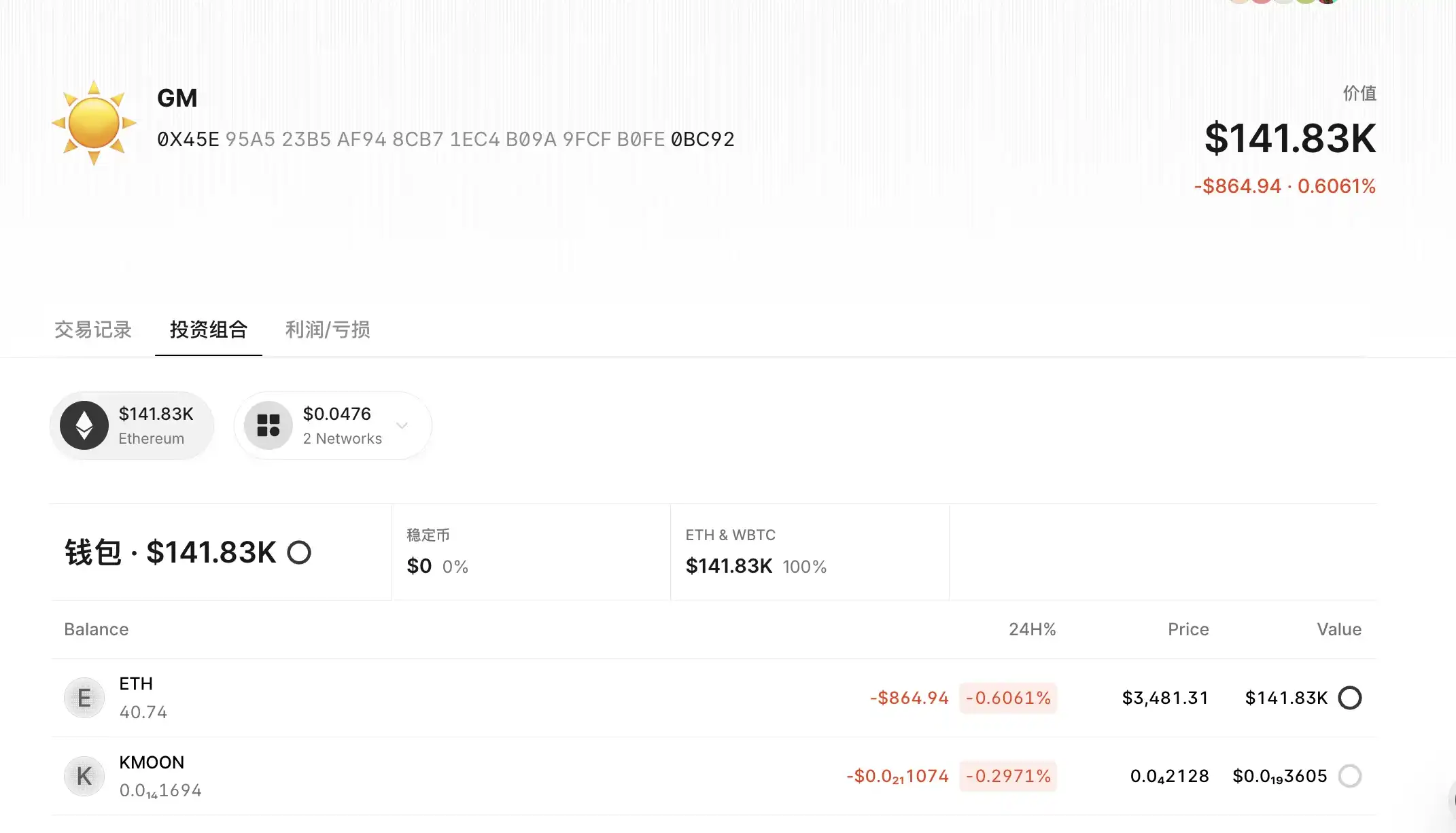 钱包资产:目前仅剩余 ETH 及某不知名 Meme 币 KMOON,余额总计 14.1 万美元;