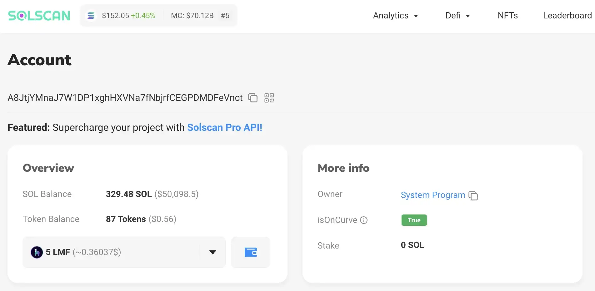 钱包资产:目前该地址仅持有 329 枚 SOL,价值 5 万美元左右;