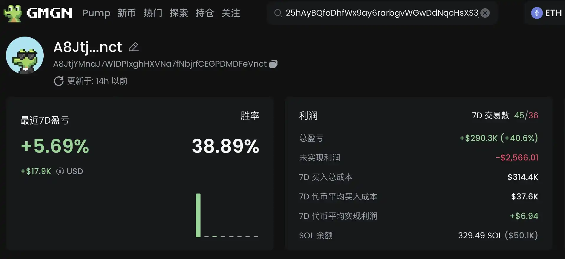 此前据链上分析师 @ai_ 9684 xtpa 监测,某聪明钱曾在一小时内交易 MANEKI 累计获利 1412 SOL,回报率高达 1008% 。该地址在 MANEKI 上线后三分钟后花费 140 SOL 买入 4660 万枚代币,成本为单枚代币 0.0004596 美元,随即在 27 分钟后以 8 倍价格卖出了 70% 持仓,剩余 1400 万枚仍浮盈 636 SOL。值得一提的是,根据 Gmgn.ai 追踪信息显示,该地址 7 天内盈利 1.79 万美元,胜率则相对较低,仅为接近 40% 左右。