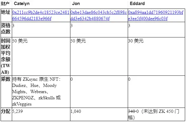 满足的资格标准数量只是决定分配大小的三个因素之一。ZKsync 空投分配是资格标准、ZKsync Era 上的时间加权平均余额 (TWAB) 和奖金乘数的组合。