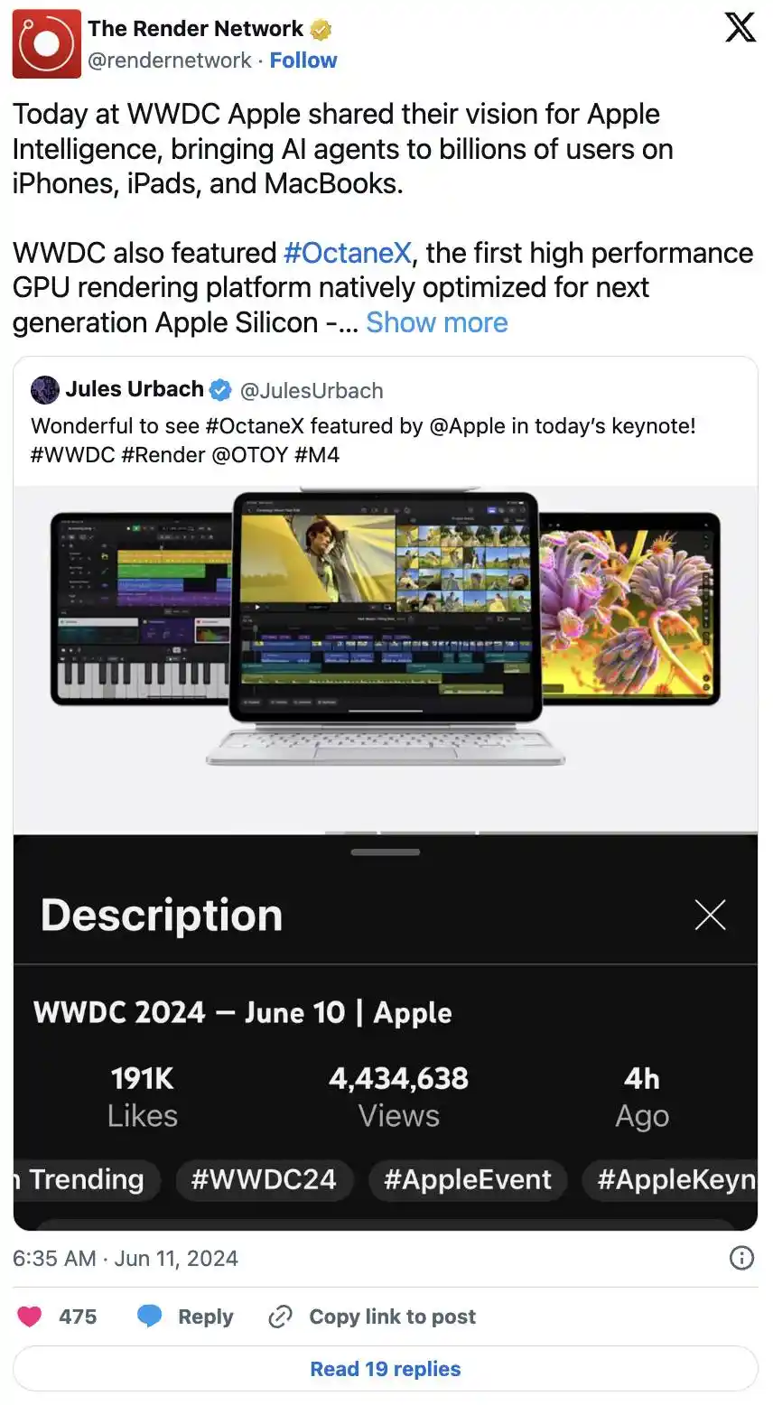 在今年的 WWDC 大会上,Apple 发布了Apple Intelligence,这是其新推出的 AI 功能套件,适用于所有设备。每个大型科技公司都在加入 AI 的行列,这并不令人意外。真正引人注目的是在最新的 iPad Pro 上展示的 OctaneX,这是一款由 Render Network 支持的 3D 设计软件。