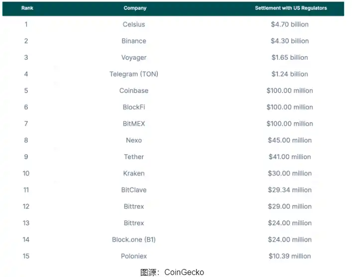 据 CoinGecko 统计显示,遭到美国监管机构起诉且和解金额超过千万美元的加密企业中,超过半数依旧正常经营,包括如今市值在所有加密资产中排名前十的 Telegram(Ton),美国最大合规加密交易平台 Coinbase,以及全球最大稳定币发行商 Tether 等。