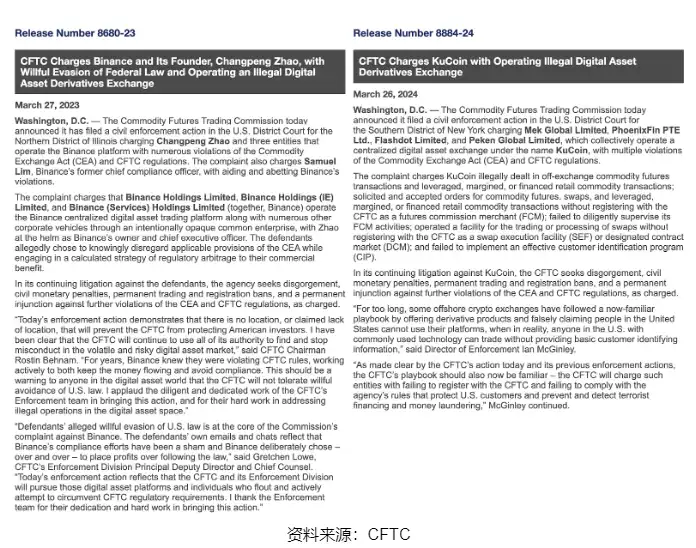 2024 年 3 月 26 日,CFTC 指控 KuCoin 违反了《商品交易法》(CEA)和 CFTC 规定的多项规定。这是继 Binance 之后的又一起重要案件,恰好两起案件之间相差刚好一年。