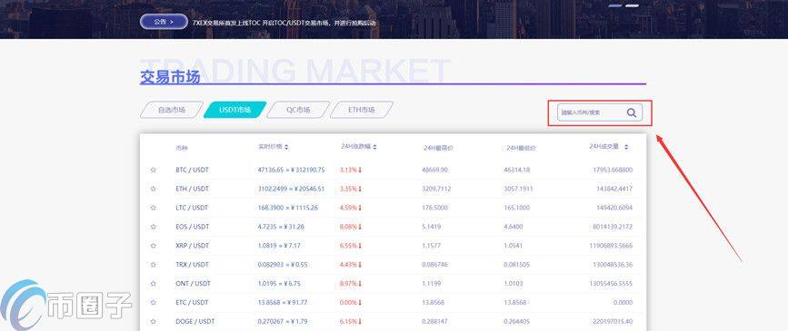 1.打开7XEX交易所官网,选择我们想要的币种,在首页进行搜索,我们以BTC为例。