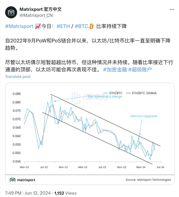 6 月 12 日,Matrixport 官方发文表示,自 2022 年 9 月 PoW 和 PoS 链合并以来,ETH/BTC 汇率一直呈明确下降趋势。尽管以太坊偶尔短暂超越比特币,但这种情况并未持续。随着汇率对接近下行通道的顶部,ETH 可能会再次表现不佳。