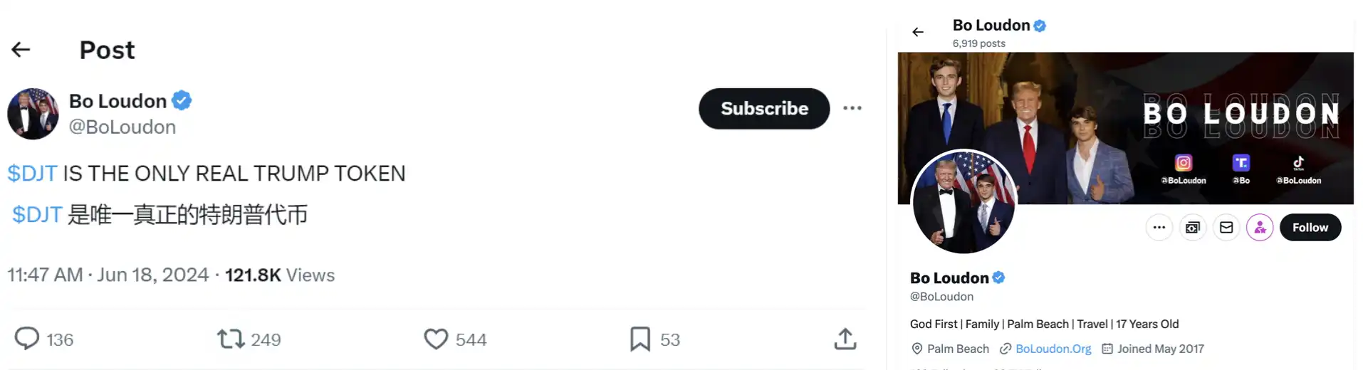 上午 11 点 47 分,一个头像为特朗普合照的 Bo Loudon 发文表示「$DJT IS THE ONLY REAL TRUMP TOKEN(这是特朗普唯一官方的 meme 代币)」,据 Blockbeats 了解,Bo Loudon 跟特朗普家族还有特朗普系显贵交往密切,是特朗普的铁粉,其推特背景图是一张和特朗普家族的合照。
