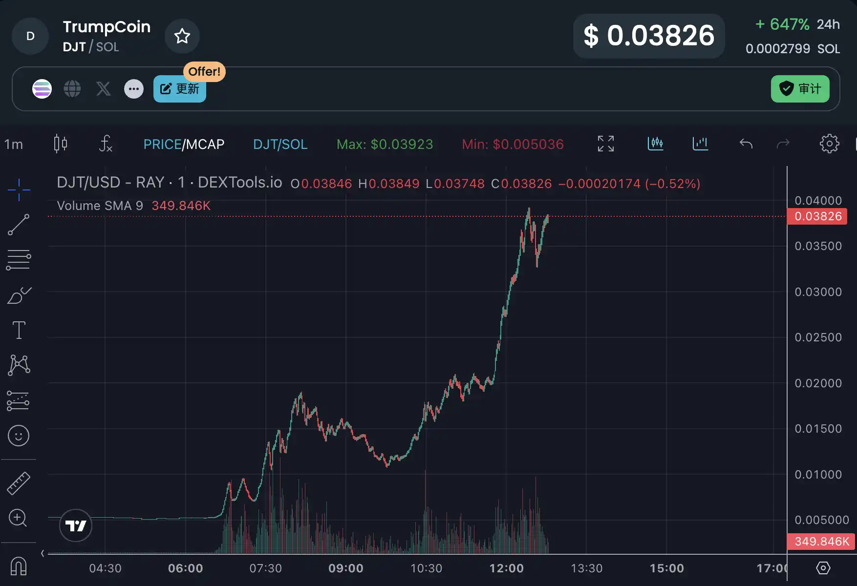 此外,Bo Loudon 的个人网站上有多张和 Trump 的合照,也有一些和特朗普家族成员的合影。正因如此,社区推测 Bo Loudon 的喊话某种意义上代表着官方的态度。在 Bo Loudon 发出推文之后的半个小时里,$DJT 一路从 0.02 美元涨到 0.045 美元附近,可以说「应声翻倍」。高峰时,$DJT 的市值突破 $380M,超过另一特朗普系 meme 币$TRUMP 的$325.6M,交易量达 12.8 万美元。