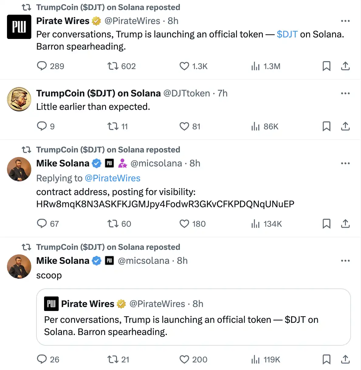 此次事件的唯一信源 Pirate Wires 在之后没有放出更多讯息,其主编同时也是 Founders Fund 的 CMO Mike Solana(本人表示 Solana 是他的姓)则转发了原帖并放上了代币合约地址,而同时间诞生的$DJT 官方推特也与其互动密切。