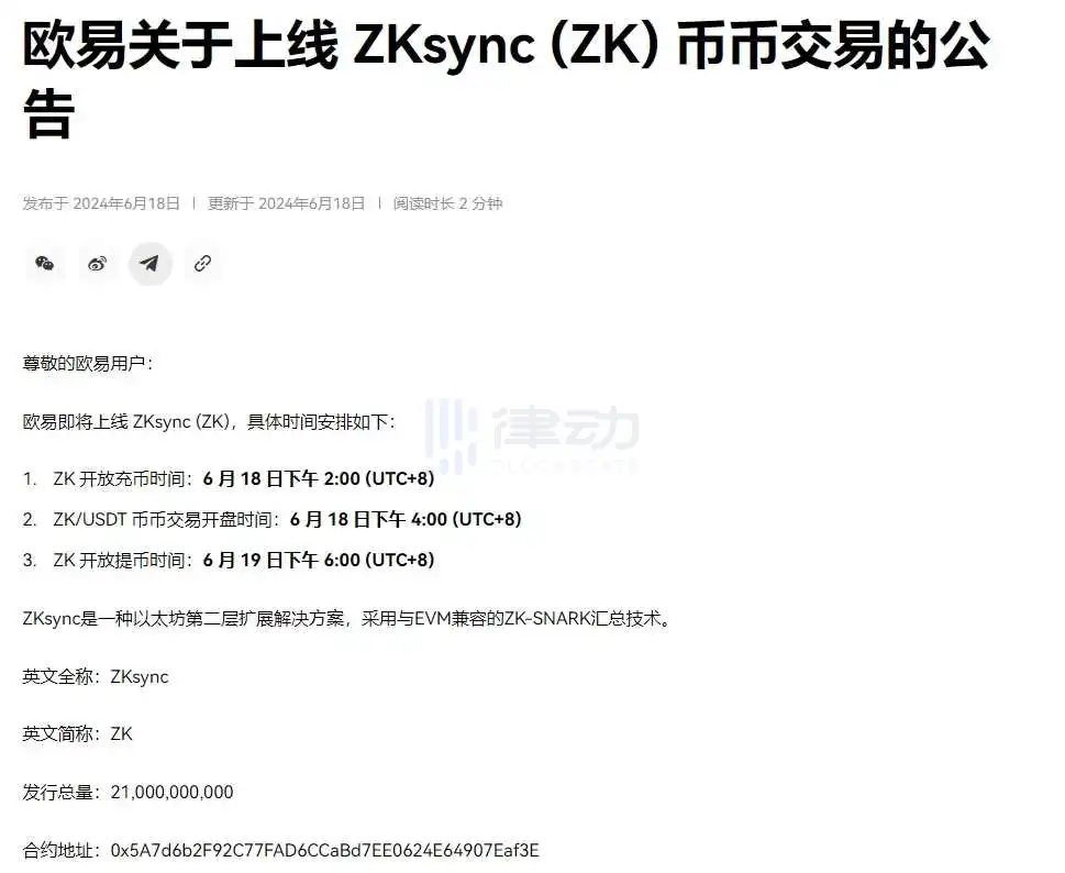 BlockBeats 消息,6 月 18 日,据官方消息,OKX 即将上线 ZKsync (ZK),ZK/USDT 币币交易开盘时间为 6 月 18 日下午 4:00 (UTC 8)。