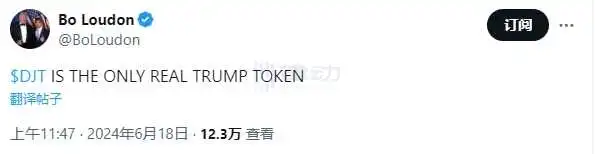 BlockBeats 消息,6 月 18 日,特朗普知名支持者 Bo Loudon 在其社交平台表示,DJT 是唯一真正的特朗普代币(「DJT IS THE ONLY REAL TRUMP TOKEN」)。