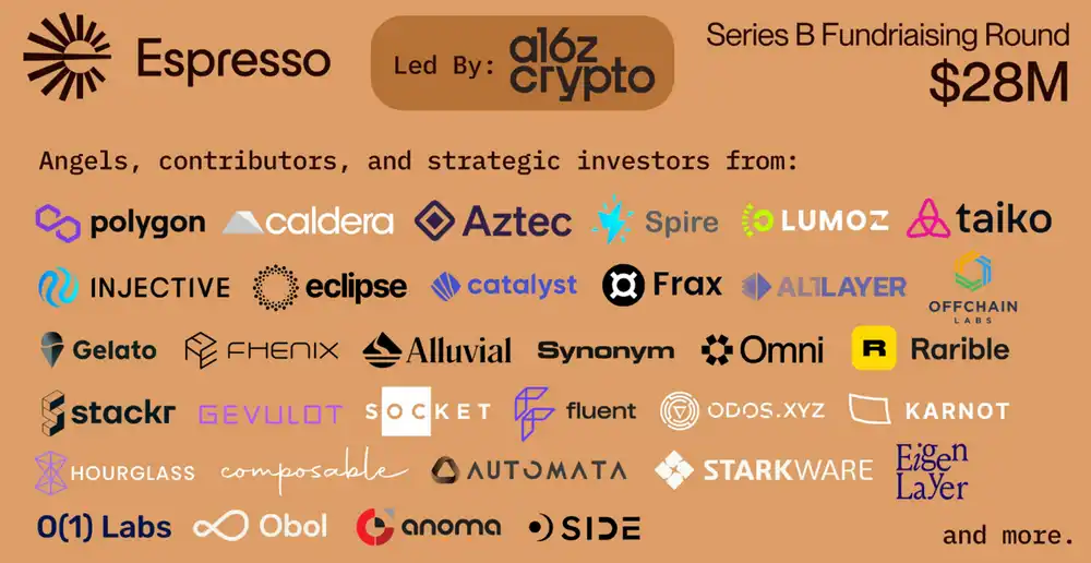 · 2024 年 3 月 21 号,Espresso Systems 公布已完成由 A16zcrypto 领投的 2800 万美元 B 轮融资。Espresso 指出,Polygon、Taiko、o1Labs、StarkWare、Offchain Labs 以及来自 30 多个生态系统项目的战略投资者加入了他们最近的 B 轮融资。