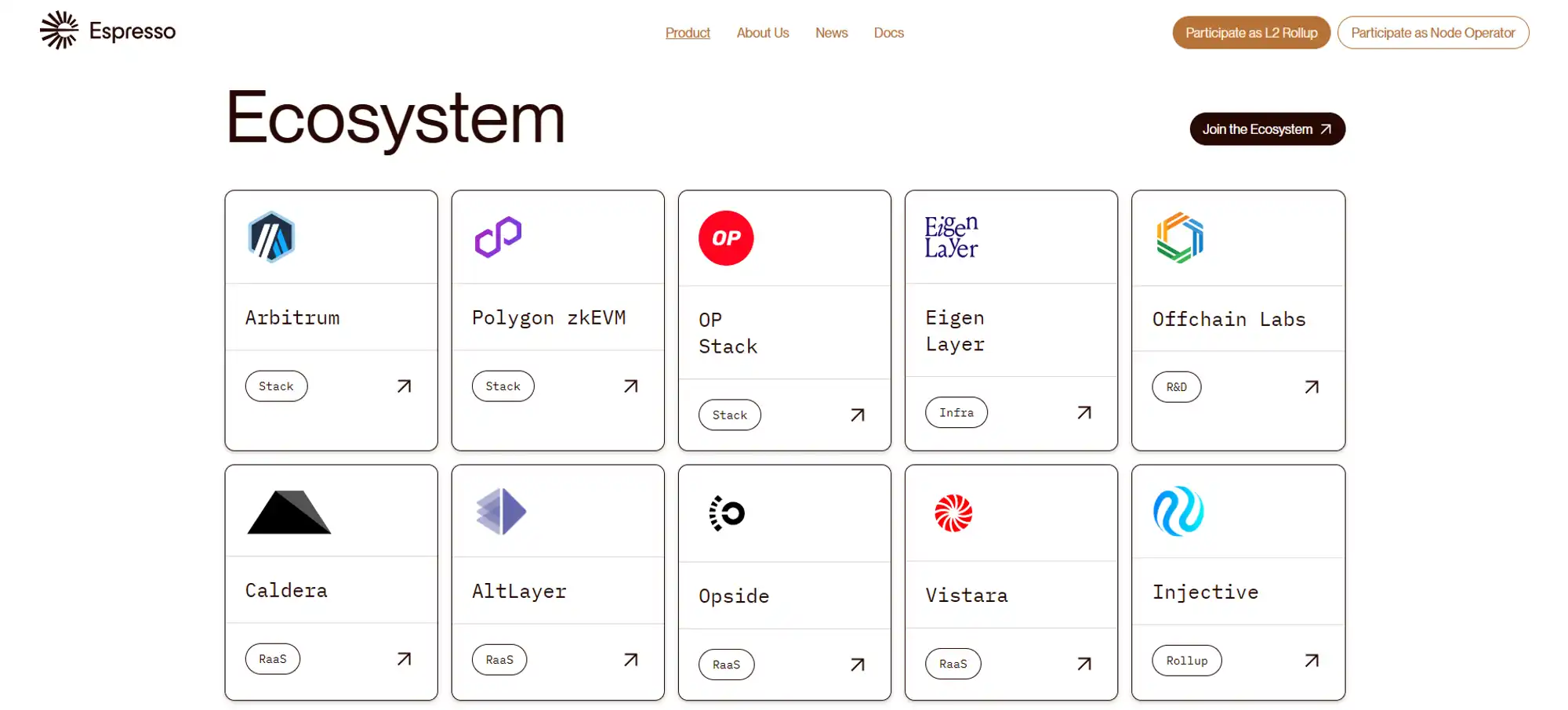· 2024/01/26—- Espresso Systems 和区块链基础设施提供商 Blockdaemon 合作,后者通过部署外部定序器节点来支持 Espresso Systems。其将管理位于欧洲和亚洲的 4 个测序节点。目前合作的 2024/03/08—- Espresso Systems 和 Across 合作,此次合作将让 Across Protocol 利用 Espresso 的快速预确认功能,该预确认由 HotShot 共识协议保障,该协议在连续两个区块后达到最终结果。该集成将利用 HotShot 的共享安全性和快速最终性来在 Rollup 之间进行桥接。