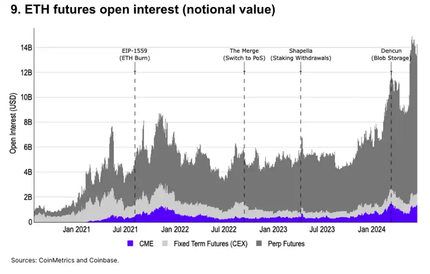 内源性 ETH 催化剂对未平仓合约的影响通常是可见的,在美国批准现货 ETH ETF (19b-4 文件) 之后,未平仓合约的最后一次大幅飙升。在此之前,3 月 13 日的 Dencun 升级令未平仓合约达到顶峰。