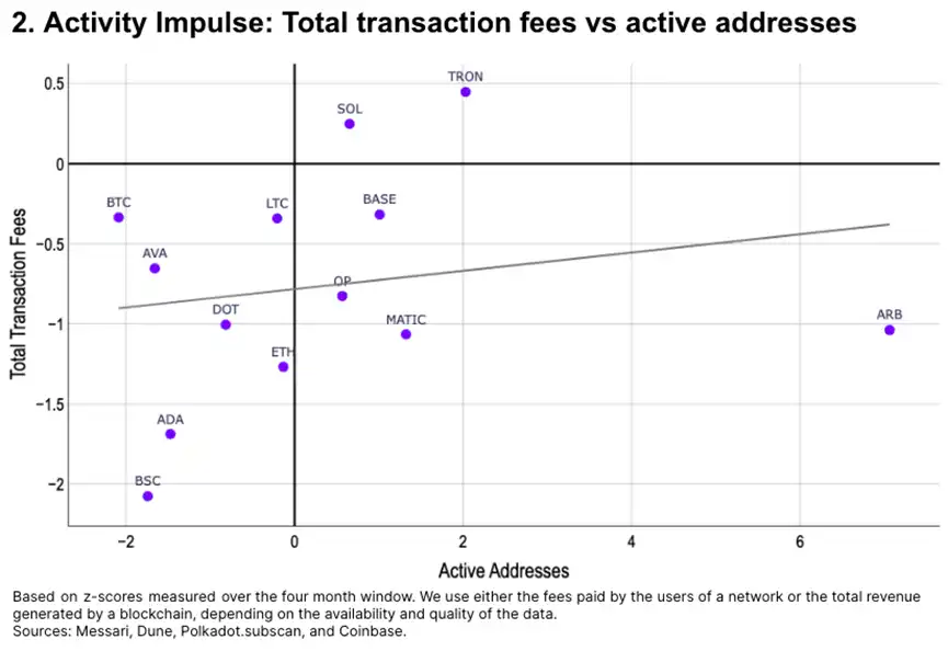 我们比较了每个网络 5 月份的 (1) 平均每日活跃地址数与同期的 (2) 平均每日费用或收入,两者都以与前四个月 (1 - 4 月) 相比的标准偏差来衡量。它显示: