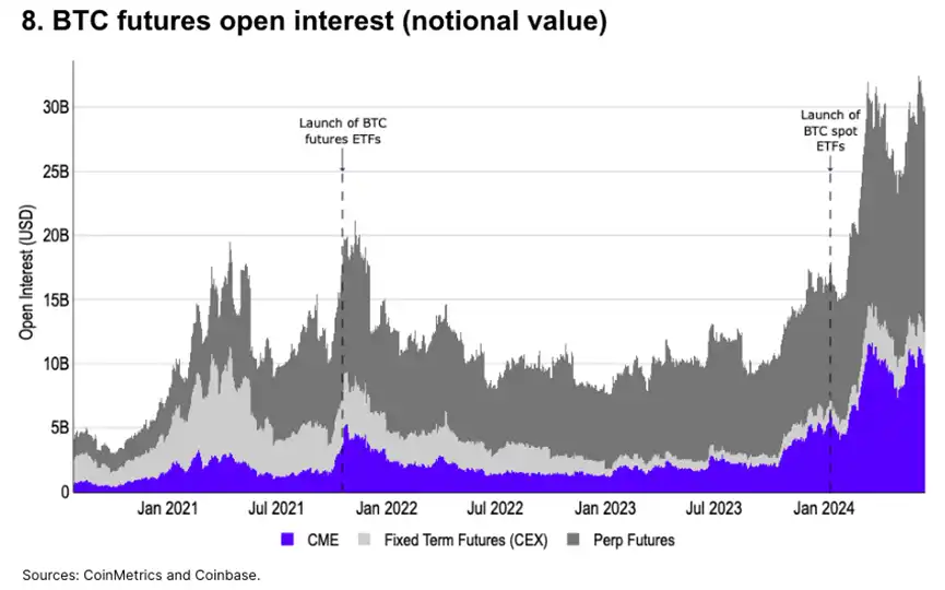另外,中心化交易所的传统固定期限期货仍然很受欢迎,其未平仓合约金额与 CME 期货相当。