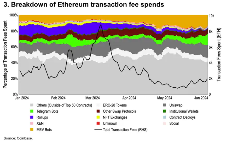 在 3 月份升级了 Dencun 之后,rollup 的支出从占主网费用的 12% 逐渐减少到不足 1%。MEV(最大可提取价值) 驱动的交易费用从 8% 上升到 14%,直接交易费用从 20% 上升到 36%。尽管 ETH 从 4 月中旬开始出现通胀,但我们认为市场波动的回归 (以及高价值的交易需求) 可能会抵消这一趋势。