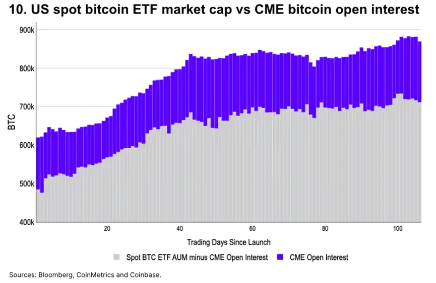 将现货 ETF 总市值与 CME 比特币未平仓合约的对比标准化表明,自 4 月初 (第 55 天) 以来,大部分现货 ETF 流动可归因于基差交易。