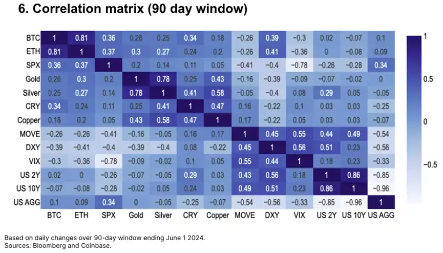 基于 90 天的窗口,比特币的回报似乎与一些关键宏观经济因素的每日变化适度相关。这包括美国股票、大宗商品和多边美元指数,尽管与黄金的正相关性仍然相对较弱。