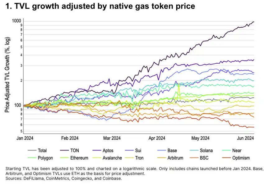 我们不是比较不同链的原始 TVL,而是通过其原生 gas 代币的价格升值来跟踪 TVL 的增长。通常,由于抵押品或流动性的使用,原生代币构成了生态系统中 TVL 的很大一部分。通过价格增长调整 TVL 增长有助于区分 TVL 增长有多少来自净新价值创造,而不是纯粹的价格升值。