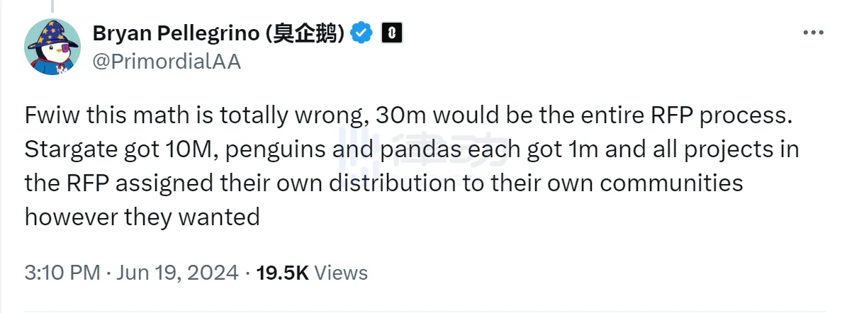 这意味着,空投的 2.38 亿枚$ZRO 中,上市首日流通 2023 万枚。而 Bryan Pellegrino 于社区表示,Stargate 生态用户共获得 1000 万枚 ZRO 空投,Pudgy Penguins 和 Kanpai Pandas 各获得 100 万枚空投,RFP 中的所有项目都按照自己的意愿将空投分配给各自社区。