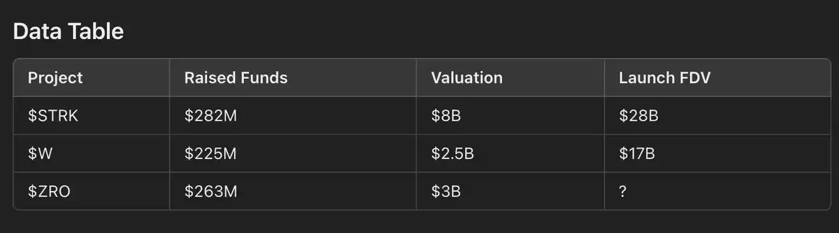 阅读上面的帖子后,可以看到预测价格涉及考虑最近启动的项目的 FDV、资金及其估值,这就是为什么我要查看 $STRK & $W 次发布,因为它们的公开和非公开估值能帮助我们预测 $ZRO FDV。