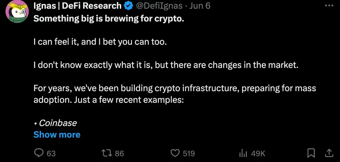 我感觉加密货币市场即将发生大事,非常看涨。虽然我不确定具体会发生什么,但市场正在经历显著变化。