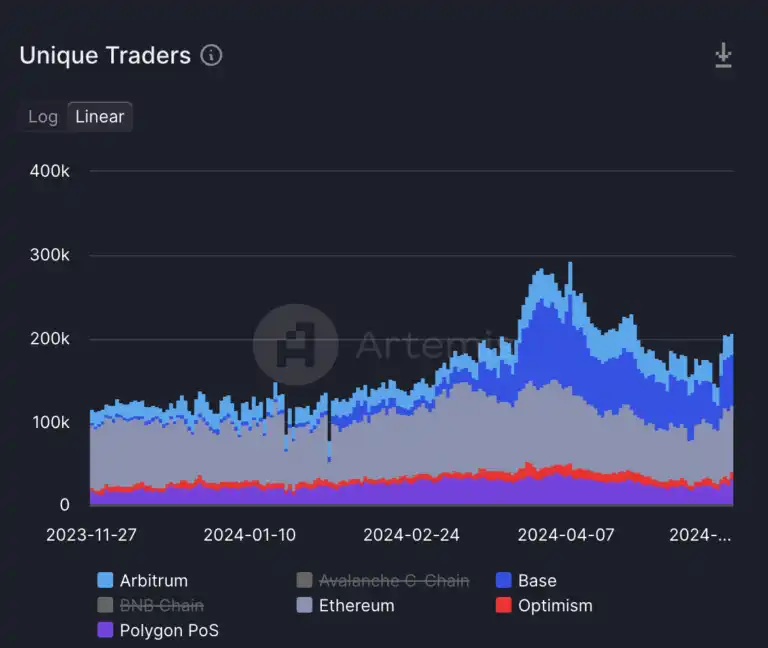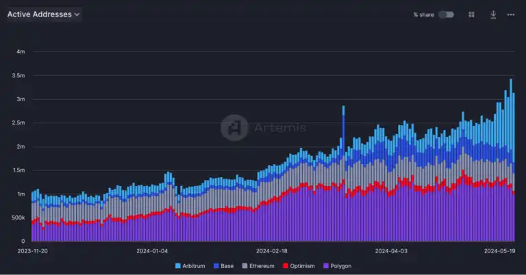 整体看待以太坊生态系统也显示出显著的增长迹象。我汇总了五个顶级以太坊链——以太坊、Arbitrum、Base、Optimism 和 Polygon——的日活跃地址。选择这五个部分是因为它们拥有丰富的应用程序和开发者生态系统。
