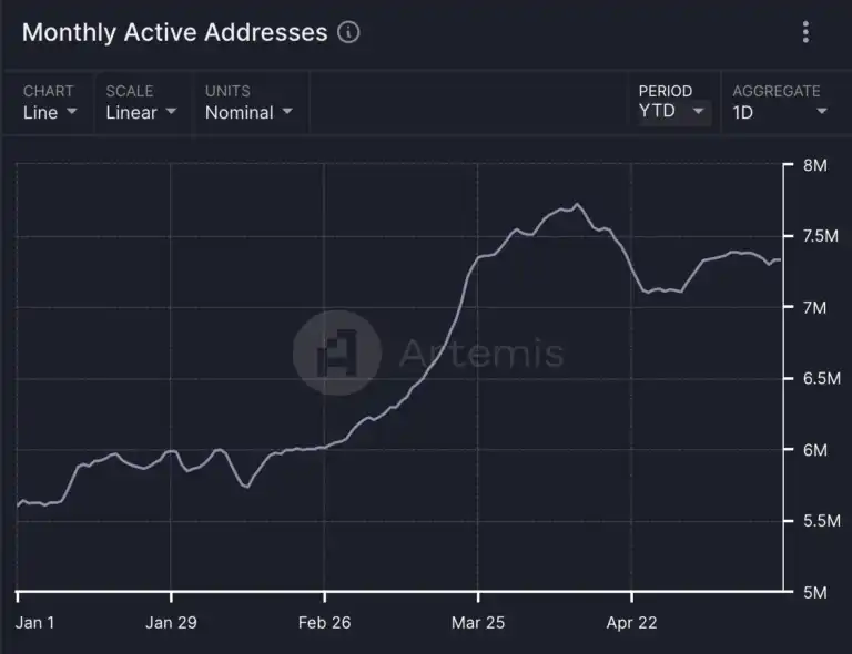 以太坊本身的月活跃地址显著增长。过去 30 天的平均值 YTD 增加了约 30%,仅比 2021 年峰值低约 10%。