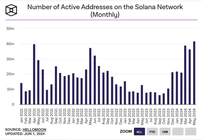 与 Solana 互动的日活跃地址比去年同期高出 2-3 倍,并且大致与 2021 年周期中活动最高的时期持平。在同一时间段内,每月活跃地址数量增加了 3-4 倍,2024 年 5 月创下新高: