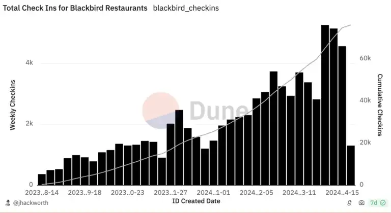 Blackbird 是为餐饮行业设计的忠诚度和奖励计划,底层使用了加密技术。当用户在连接 Blackbird 的餐厅签到时,应用程序会为他们铸造一个 NFT——这是他们访问的数字纪念品,也是网络中餐厅了解其客户用餐习惯的数据点。今天,Blackbird 主要存在于纽约市。