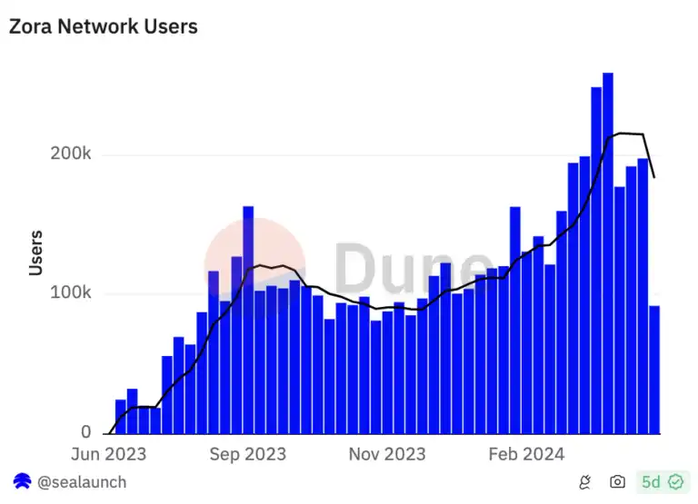 Zora Chain(也称为 Zora Network)上线约一年。在此期间,网络继续找到自己的定位。每周活跃用户同比增长约 60%,最近超过了 25 万的新高。该链还享有约 34% 的利润率,这意味着 Zora 保留了用户在交易费用上花费的三分之一的 ETH。