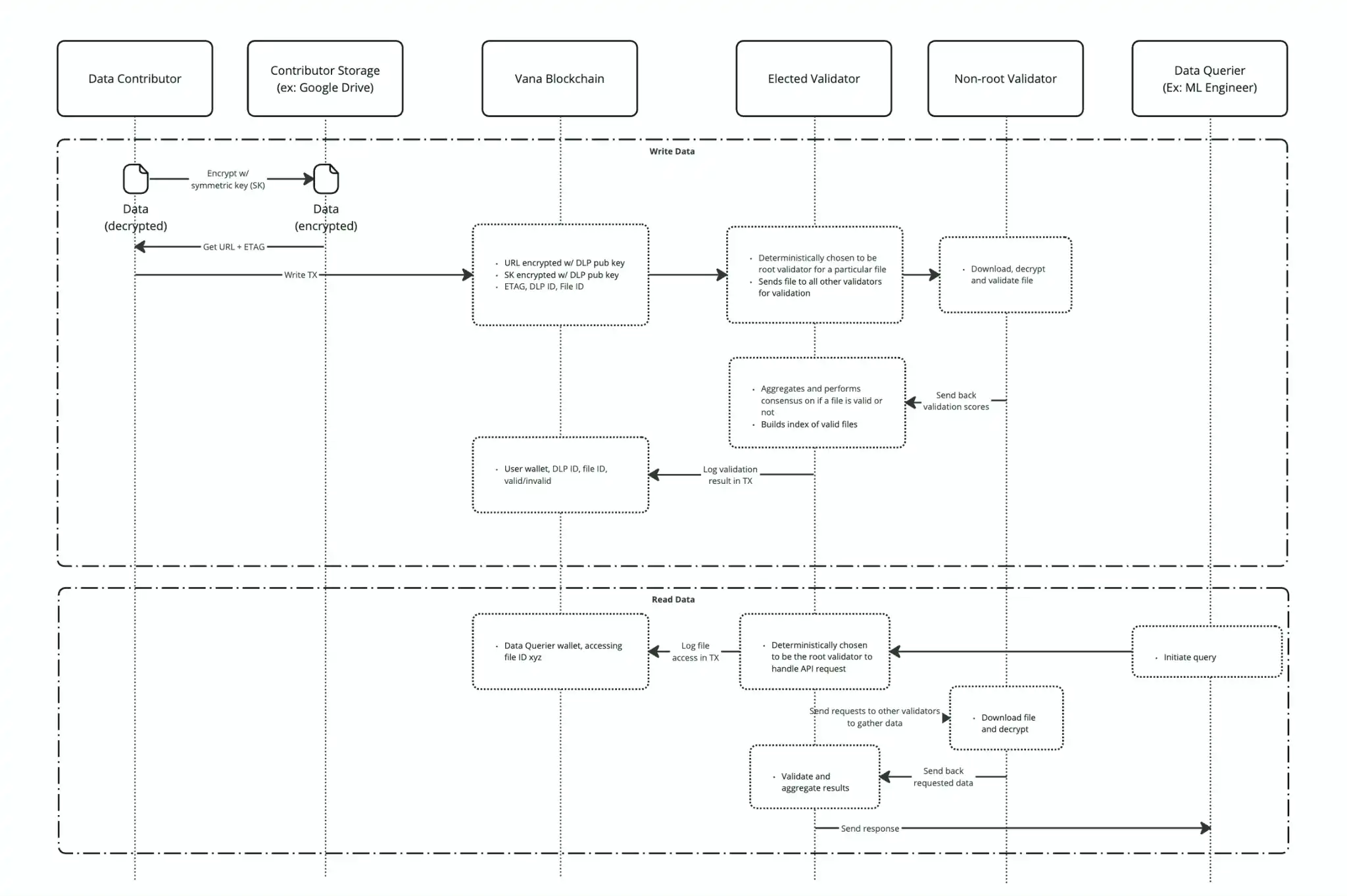 首先,数据贡献者将数据通过对称密钥加密,并将加密后的数据存储于诸如 Google Drive 的个人云存储账户。获取数据的 URL 和唯一标识符(ETAG)后,这些信息连同加密密钥一同记录到 Vana 区块链上。接着,选定验证节点作为根验证节点,负责协调其他验证节点对数据文件进行下载、解密和验证。通过模糊共识机制,验证节点们确认数据的有效性并将结果记录于区块链中,形成一份有效文件的索引。