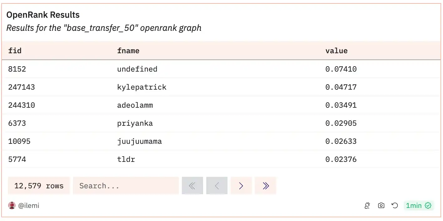 在确认输入数据的大小和连接是合理的之后,我们可以运行并保存我们的 Eigentrust 图。我将我的图保存为 id「base_transfer_50」——你可以看到下面只需 10 行代码即可训练图。可以将 OpenRank SDK 视为加密图模型的 scikit-learn。