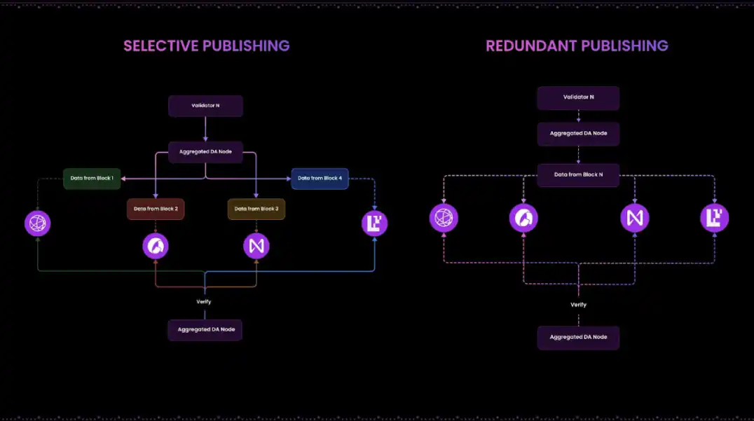 · 超额发布 - 与区块相关的数据发布到所有支持的 DA 解决方案。这种方法虽然比选择性发布成本更高,但可分散任何单个 DA 解决方案无法正常运行的风险。