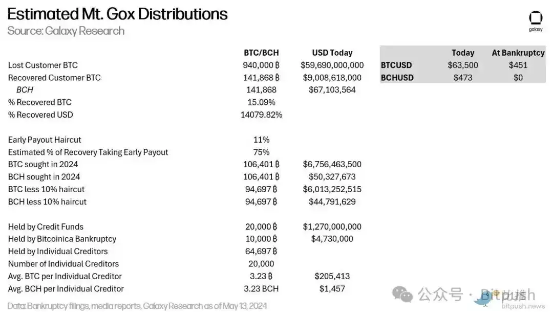 Galaxy Research 研究主管 Alex Thorn 表示,Mt. Gox 比特币进入市场后预计的抛售量将低于头条新闻报道中所暗示的数量,他分析称只有 65,000 枚比特币将分发给个人投资者。