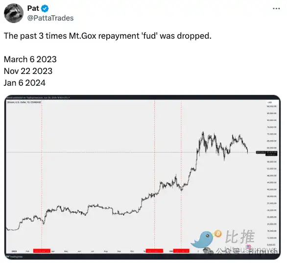加密交易员 Pat 认为,与 Mt. Gox 相关的 FUD 和回调对加密市场来说并不是什么新鲜事,因为过去三次该事件成为头条新闻时,都出现了类似的回调,但最终比特币还是走高。