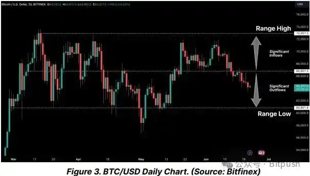 Bitfinex 分析师表示:「如前所述,ETF 的大规模抛售通常与 BTC 价格的局部触底有关。因此,加密货币总市值下降。从历史上看,这种幅度的波动通常预示着至少出现局部低点,就像 6 月 11 日的情况一样,当时类似的周内下跌导致形成新的局部价格底线。因此,存在潜在的买入机会,这些大幅下跌值得交易员密切关注。」