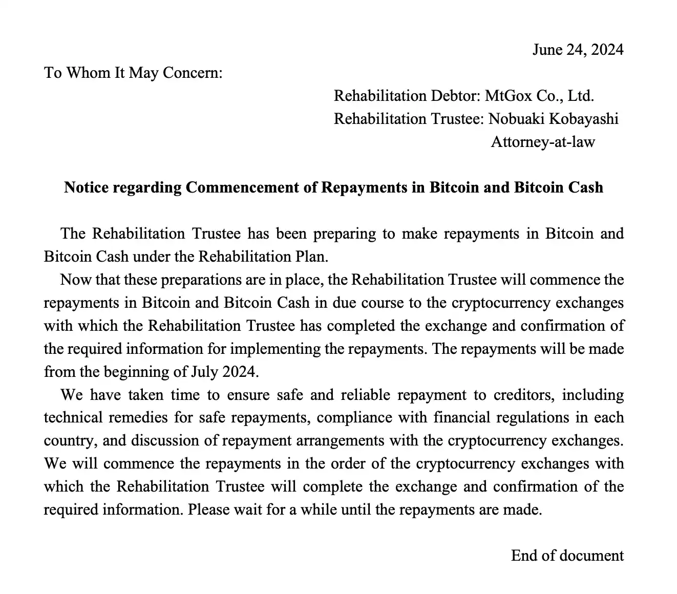 结合当时 Mt. Gox 破产清算人小林信明的邮件通告可知,该部分赔偿资金来自于小林信明于 2023 年 11 月 17 日从破产信托中赎回的 70 亿日元。