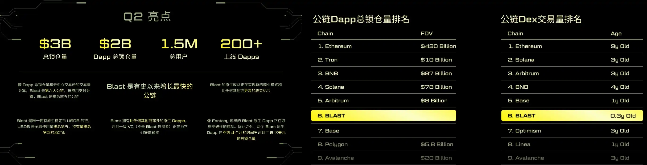 Blast 通过提供积分、金币、空投和收益等激励措施,吸引了众多用户和开发者参与。据官方数据显示,截止发稿时,Blast 网络总锁仓量超 30 亿美元,Dapp 总锁仓量超 20 亿美元,用户地址数超 150 万个,已上线超 200 个 Dapps。按 Dapp 总锁仓量和去中心交易所的交易量计算,Blast 已成为第六大公链;按费用支付计算,Blast 是排名前五的公链。