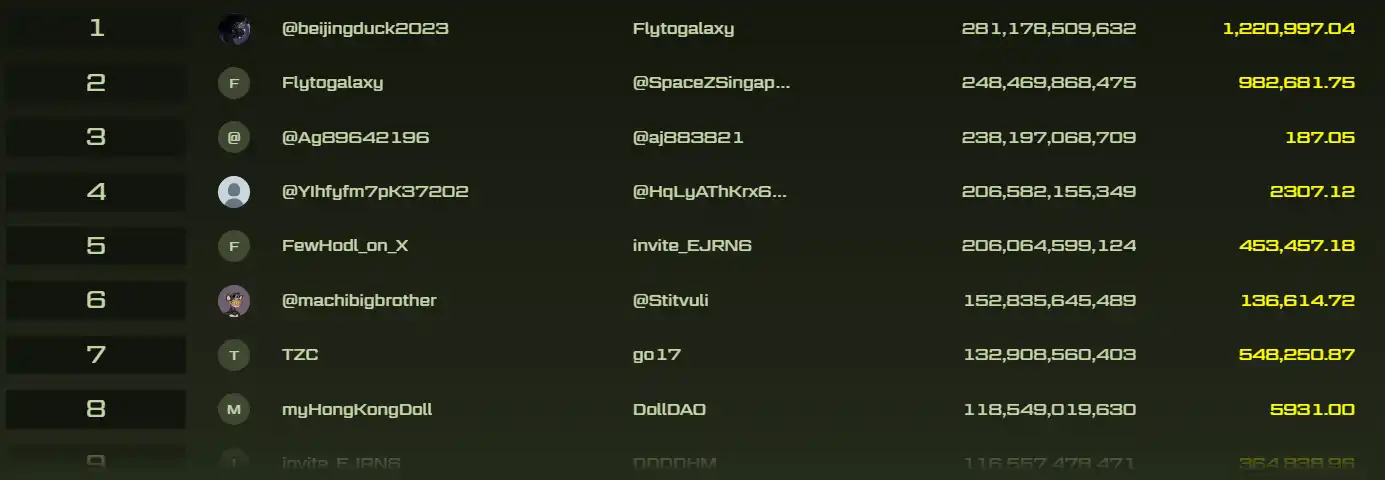 目前根据 Blast 官网页面显示,第一名用户 @beijingduck2023 总积分 2812 亿左右、黄金积分 122 万枚。