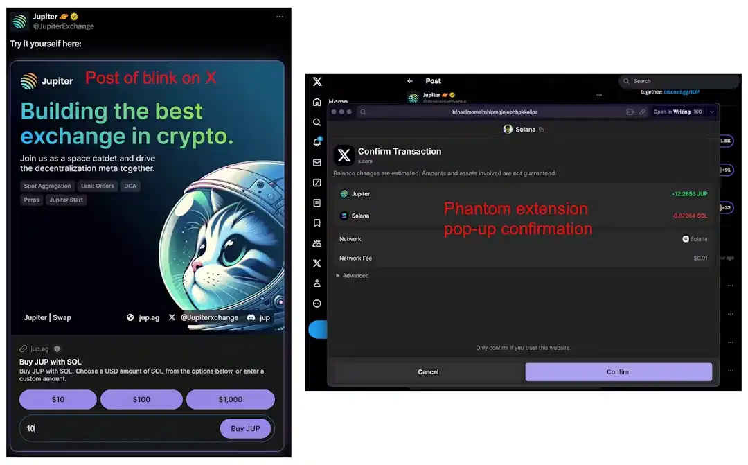 Jupiter 也分享了一个实时示例,通过 blink 让用户使用 SOL 购买 Jupiter 代币。