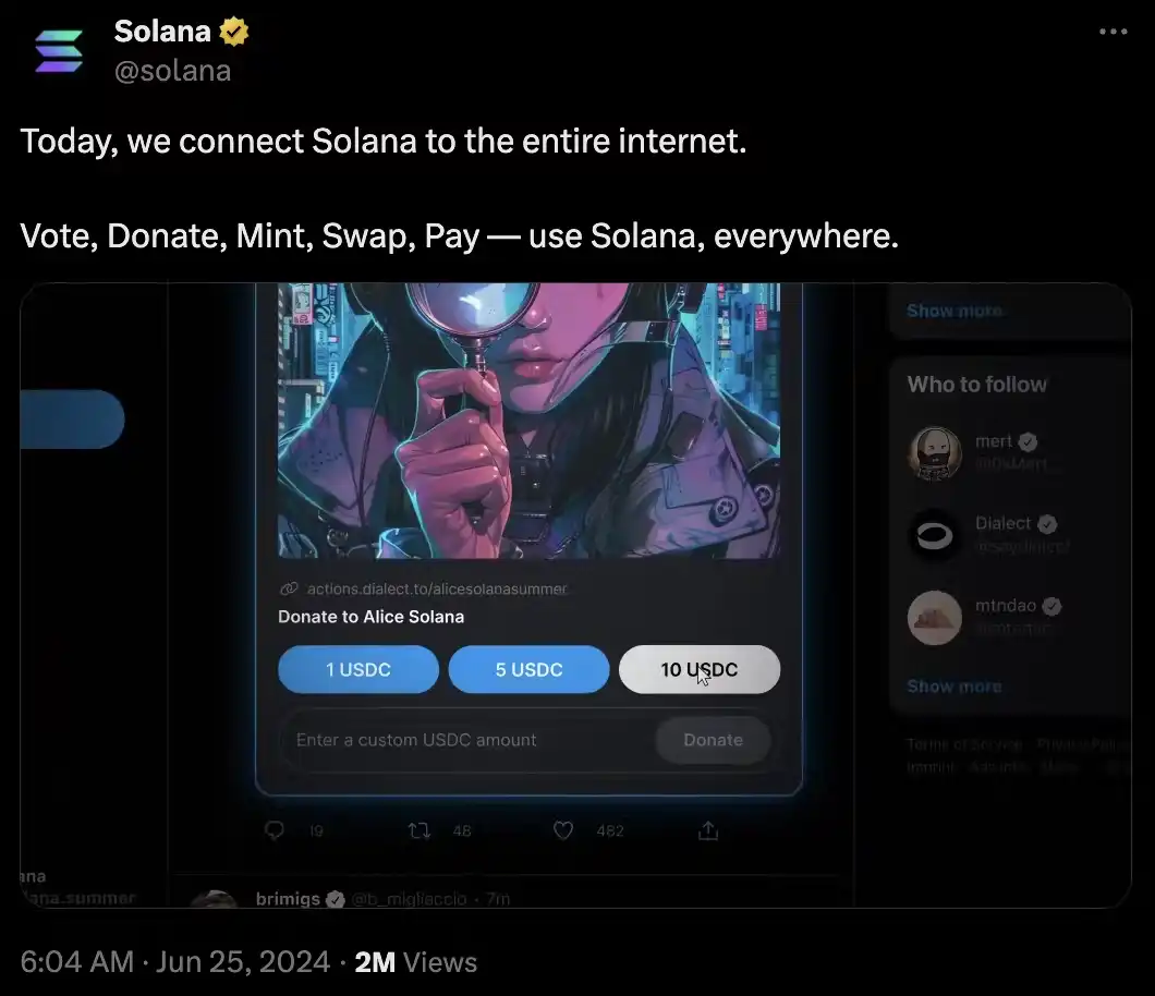 Solana 和 Dialect 也在积极提供资助,支持开发人员创建 Actions 和 Blinks 集成。