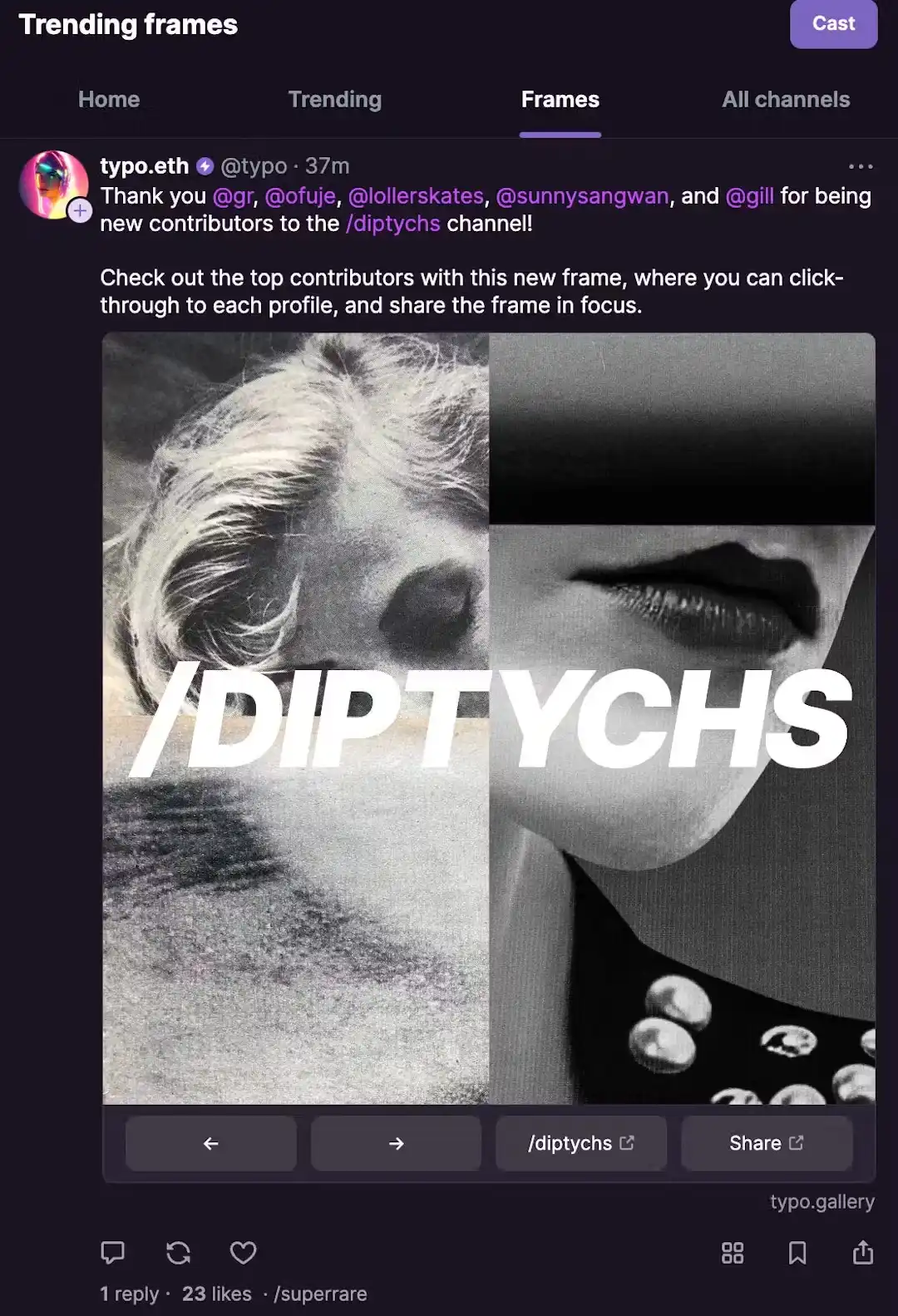 尽管感觉已经过了很长时间,但 Frames 仅在大约 5 个月前才推出。快进到今天,Frames 的使用量持续增长,它们甚至有了自己的趋势标签,嵌入为 Farcaster 生态系统的核心部分。