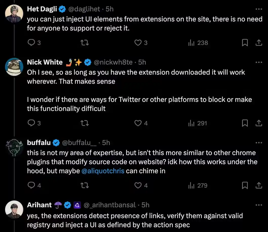 另一方面,Actions 和 Blinks 选择了更大的覆盖面,在各个渠道上扩大了可发现性、可分享性和病毒传播性。虽然存在客户端删除对 Blinks 支持的潜在担忧,但增强的用户界面元素来自 Chrome 扩展本身,这使得它成为一个游戏规则改变者。
